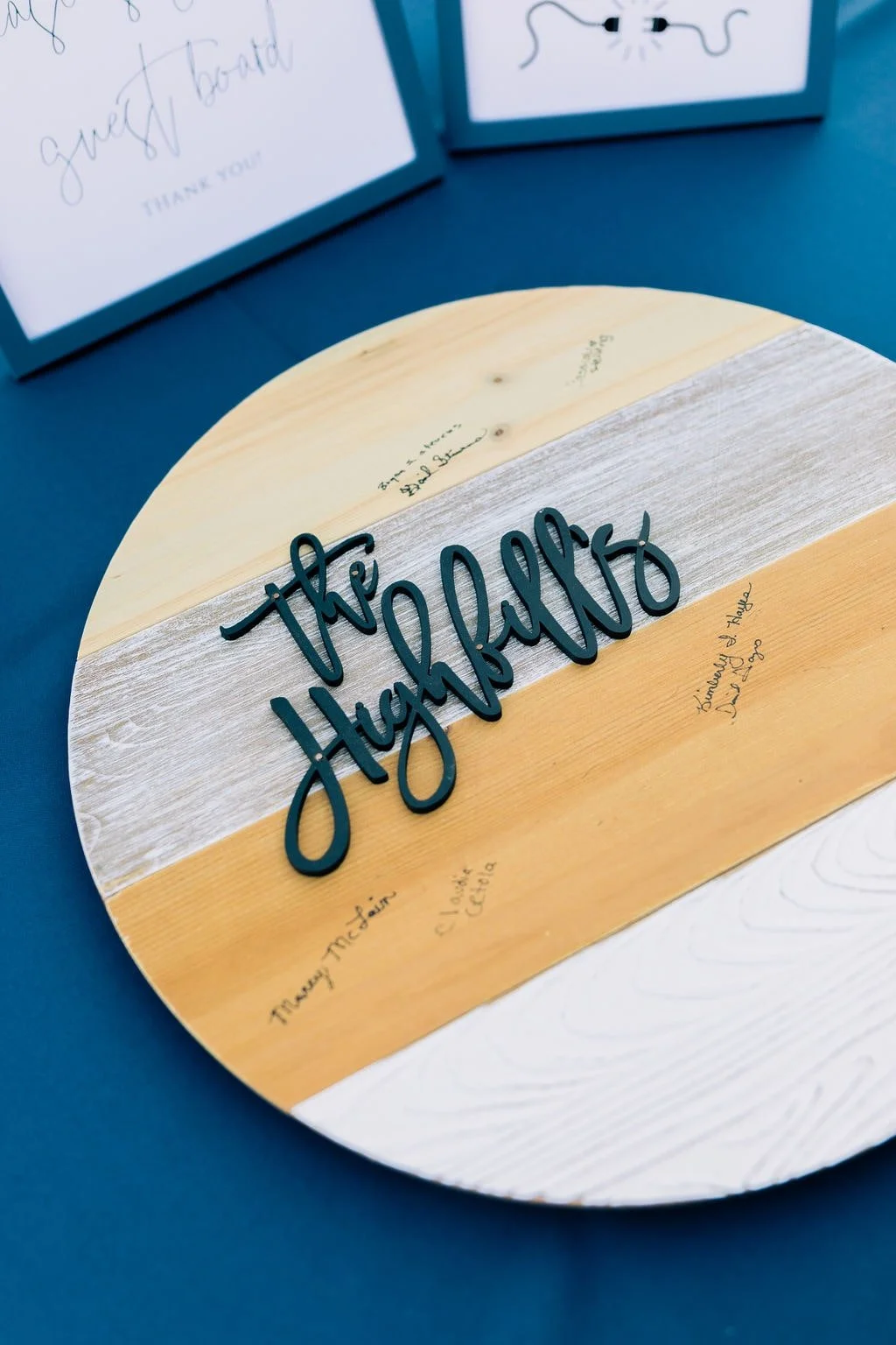 At the Pavilion for their ceremony, Erica + Ben exchanged vows in front of a custom backdrop designed by her grandpa - white arches covered in greenery. Her grandpa also created the, welcome sign, escort card stand, table number card holders, and order of events sign holder. We loved the modern look of the white and navy decor. Plus, the escort card stand were bookmarks with custom notes to each guest from the bride and groom - how sweet!?