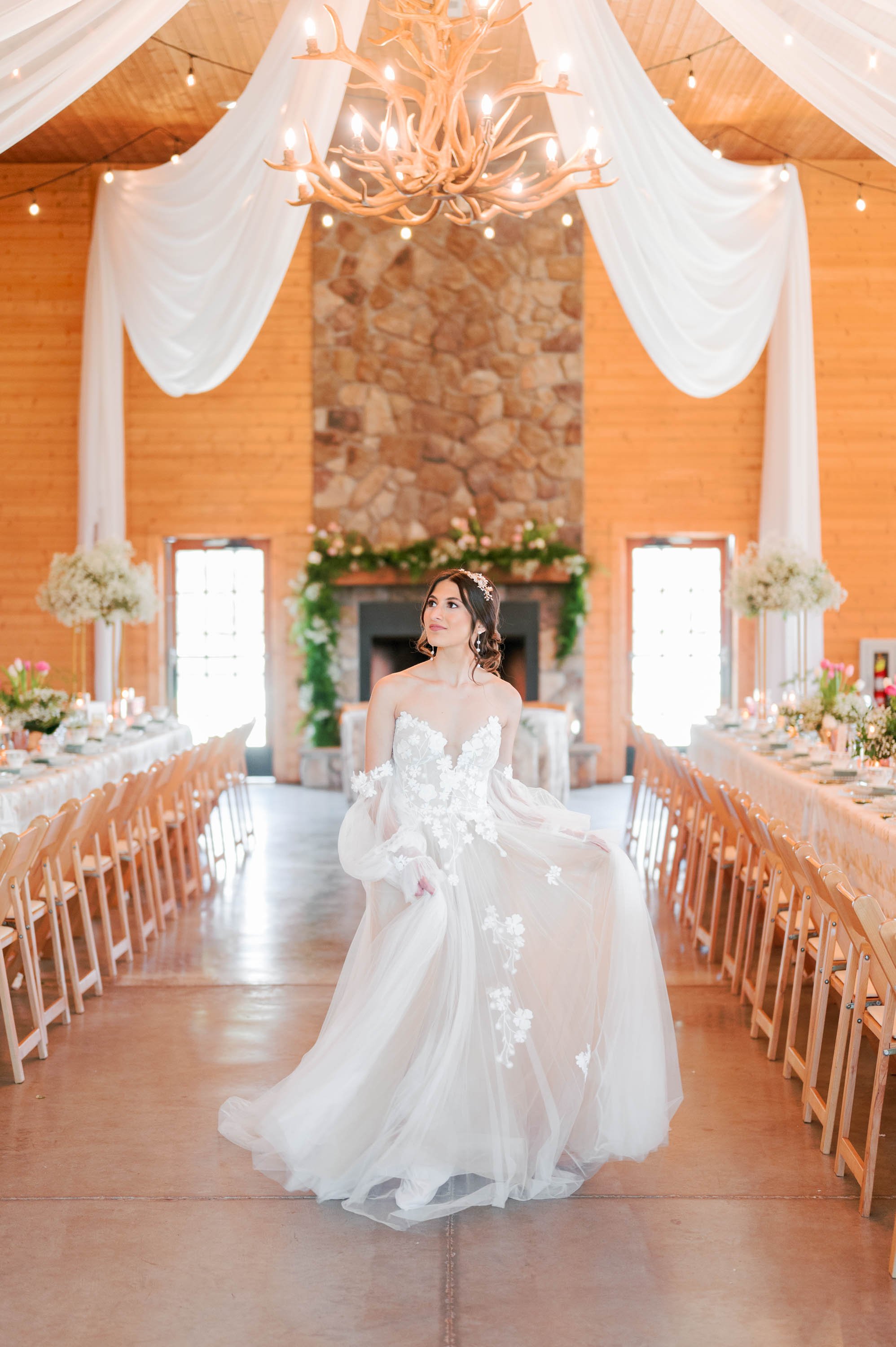 Our stunning bride for Sunday’s Open House…SWOON! Chelsea Regan glammed our model in a beautiful natural look for makeup and an artfully curled up-do with a statement hair comb piece. a & be bridal shop dressed her in the “Ayla” gown by Chic Nostalgia. The floral details and sleeves were an absolutely perfect match for this garden party at in our elegant Barn venue.
