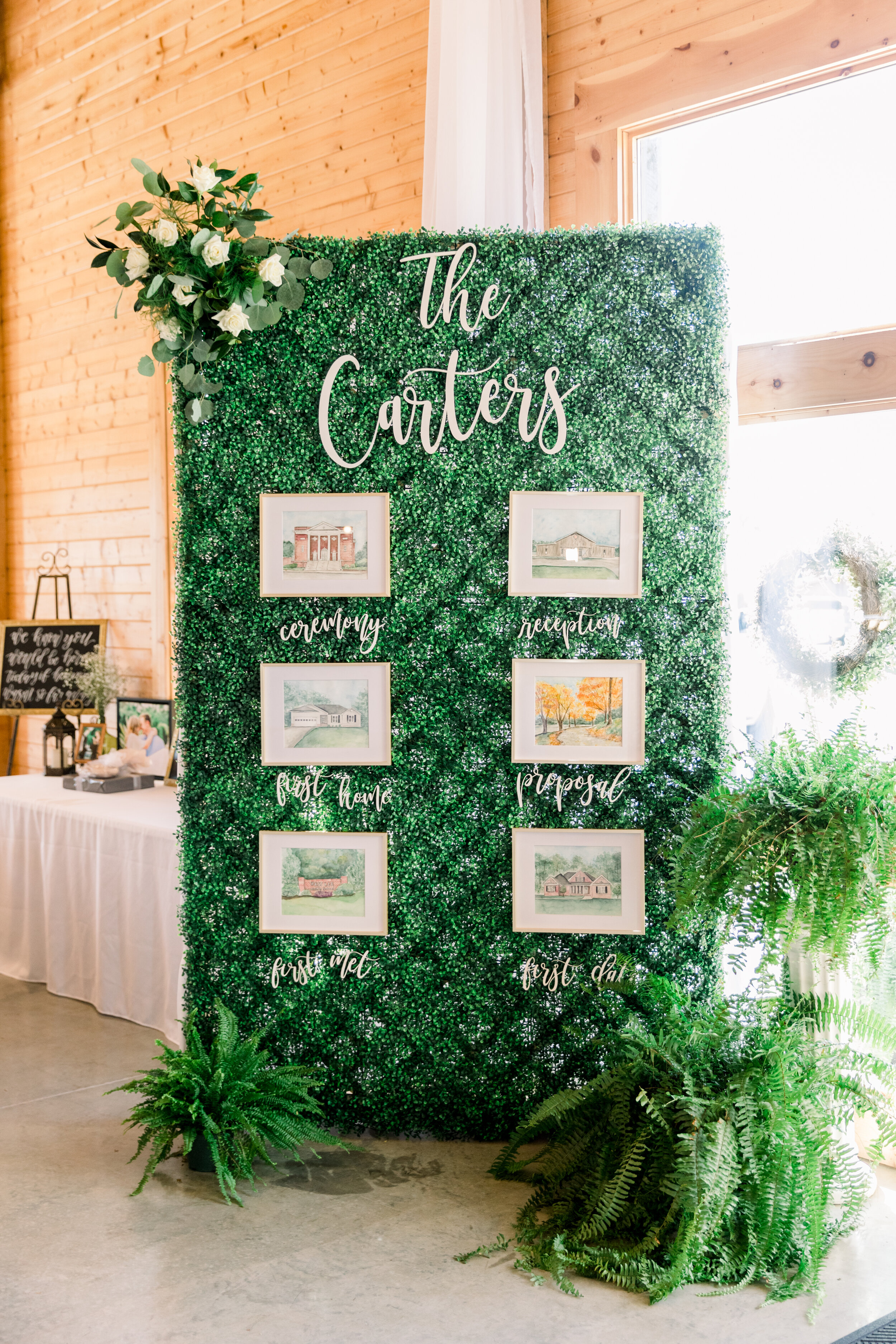 Draping caught your eye as soon as you walked in the Barn, and Ted’s Flower Basket really outdid themselves on the elevated white and green floral arrangements sprinkled across the guest tables. My favorite part of Meredith’s décor was a beautiful boxwood greenery wall featuring watercolor paintings of places that were special to her and her beau. I'm still trying to figure out how to get my own copy of the Oakland Farm painting!