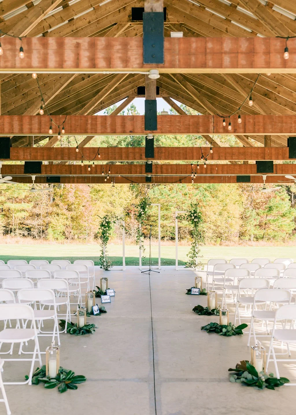 We often talk a lot about reception décor with our clients, like how to set up the Barn, table centerpieces, sweetheart tables, linen and napkin colors, place settings and glassware. Since the ceremony typically only lasts about 20 to 30 minutes out of the entire wedding day, we don’t spend quite as much time discussing the details of their vision for the ceremony design. The most popular wedding ceremony site at Oakland Farm is our open-air Pavilion. We’ve seen this space transformed in so many different ways for hundreds of ceremonies over the last several years. Beautiful arrangements on our wooden barrels, floral aisle markers, white draping, and vintage runners are just a few of our favorite things to see under the Pavilion. Every client wishes for perfect ceremony photos that capture the first kiss, the groom’s reaction to seeing the bride, or walking down the aisle hand in hand, so we’ve rounded up our favorite ceremony backdrops that frame those special moments.